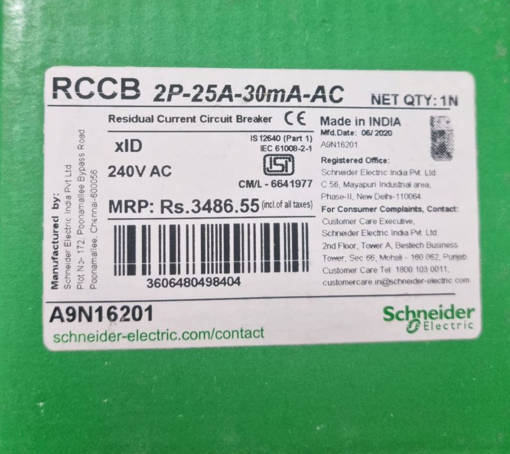 محافظ جان تک فاز 25A اشنایدر 30mA قدرت قطع 10kA